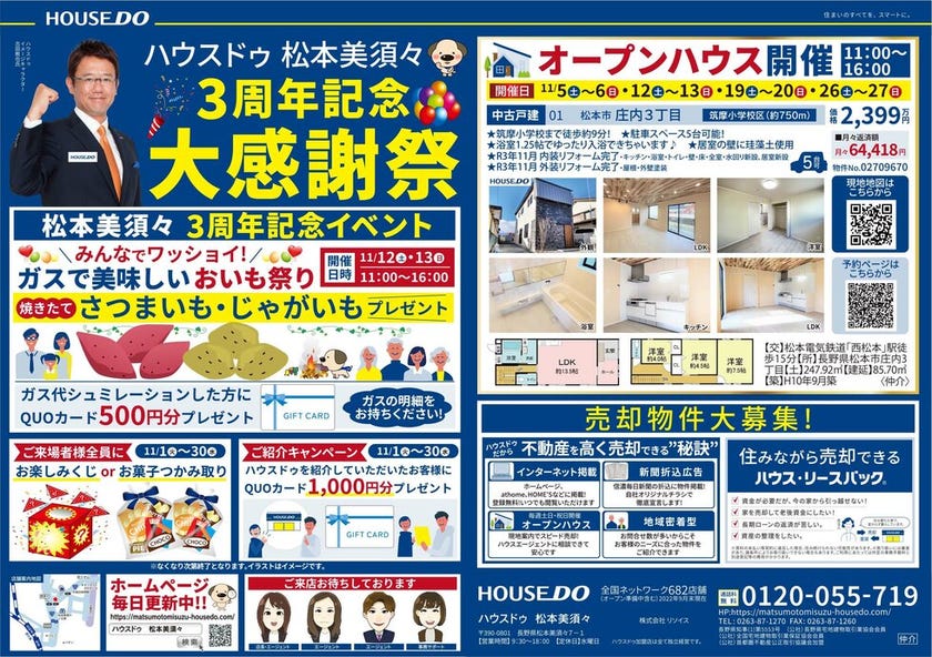 ハウスドゥ 松本美須々 3周年記念イベント開催! 11/12(土)・13(日) みんなでワッショイ!ガスで美味しいおいも...