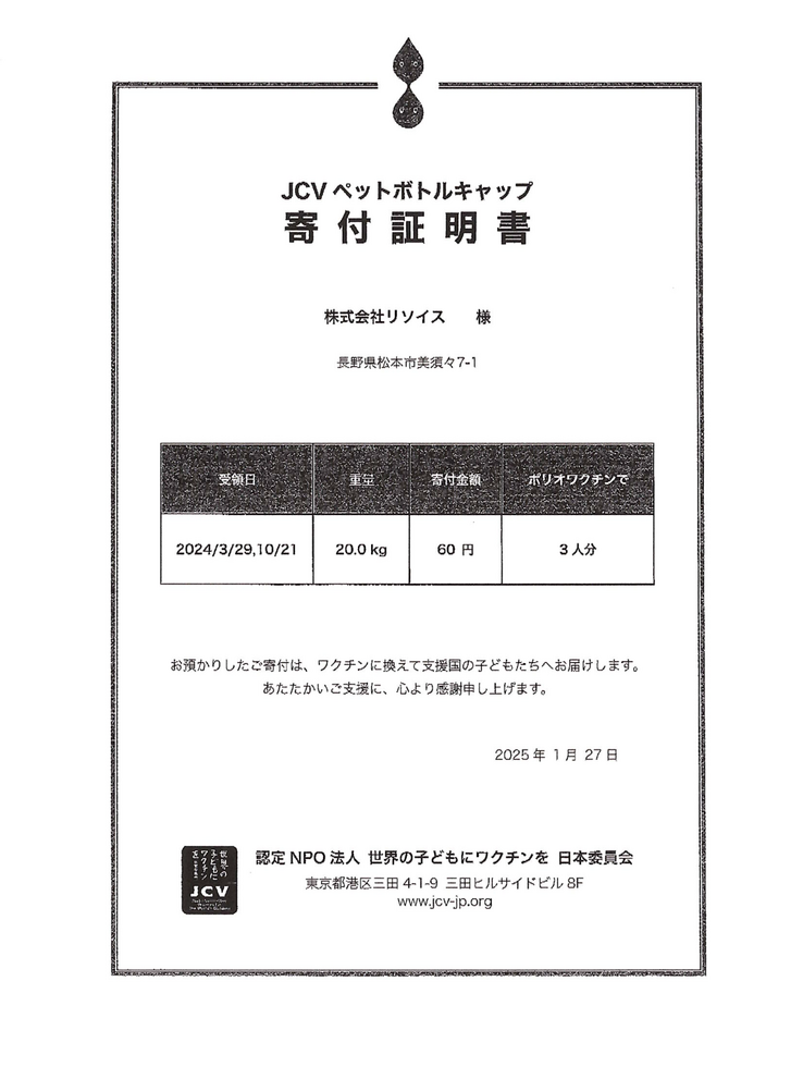 20kgのエコキャップがなんと、3人分のポリオワクチンになりました!👏