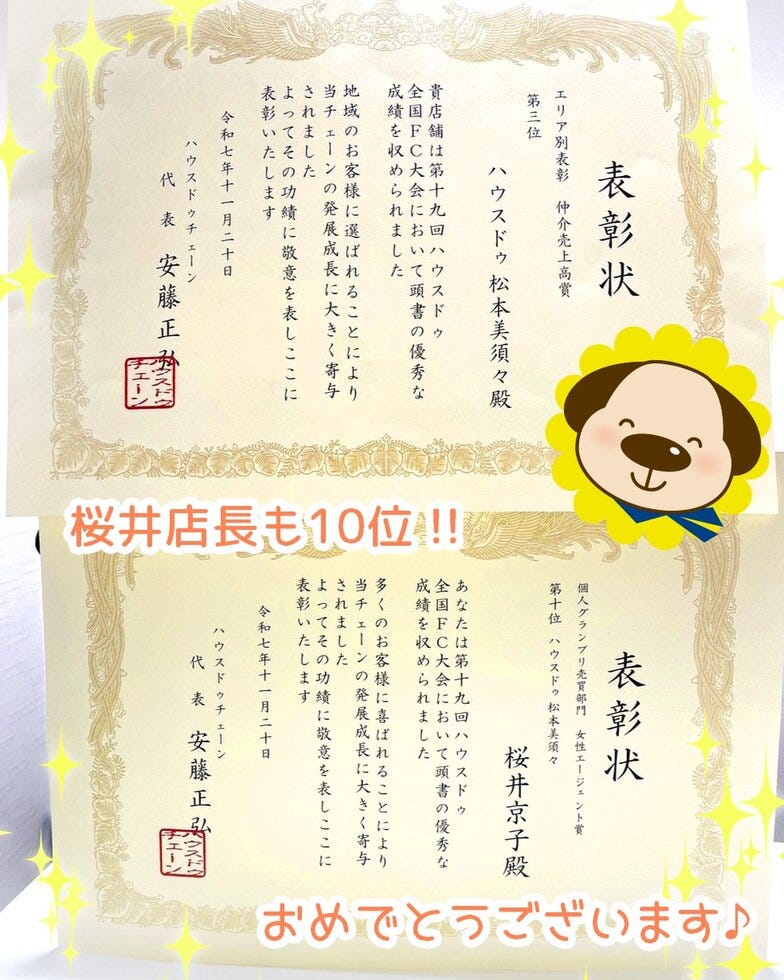 ハウスドゥ 松本美須々とスタッフが受賞した部門の表彰状が届きました!